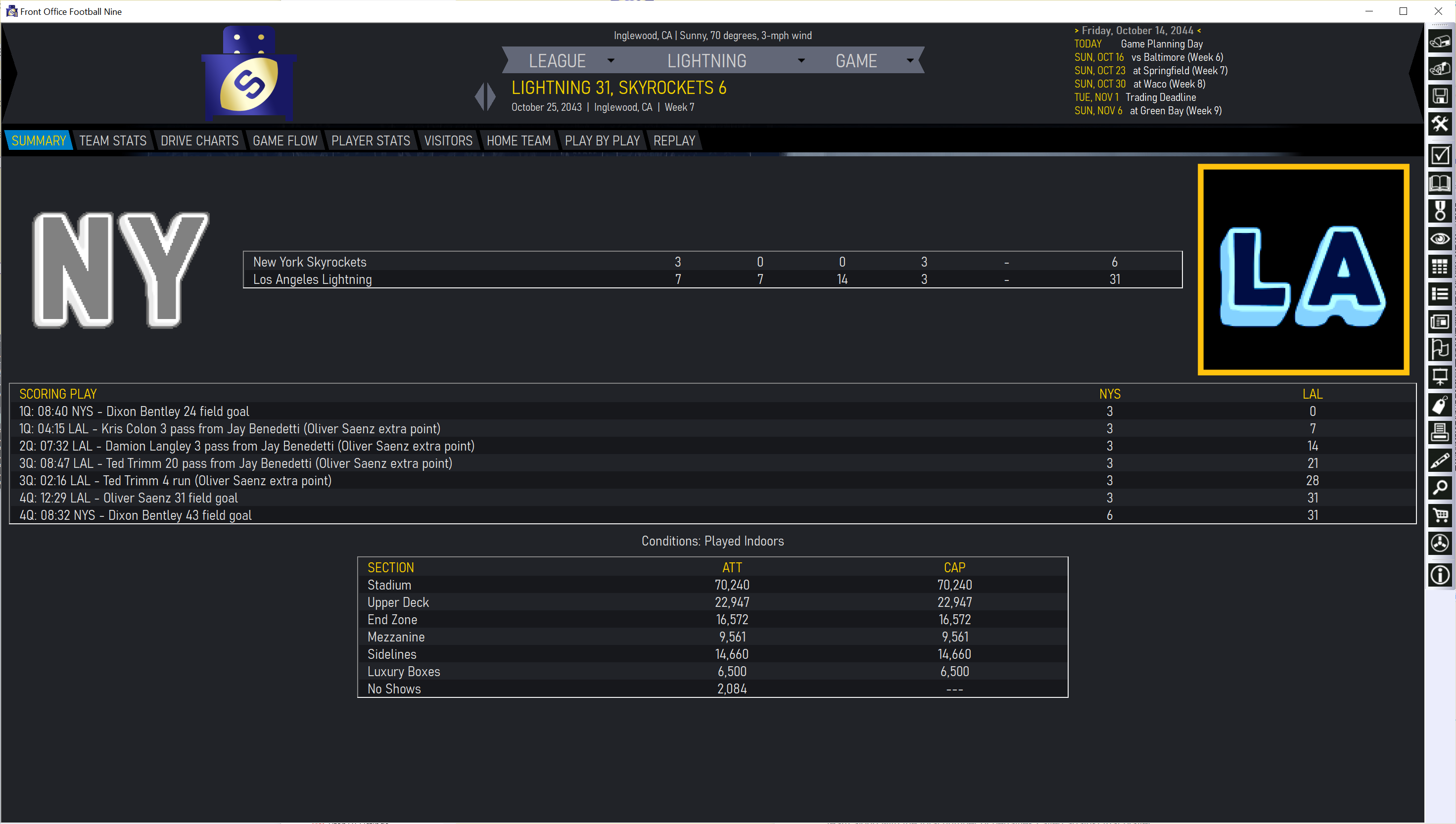 - Replay: This begins a graphic simulation of the game, play by play, showing play diagrams and a running total of individual and team statistics. This is almost identical to the interface used when calling the plays during a game, except the play-calling window is replaced by an ongoing scoring summary.