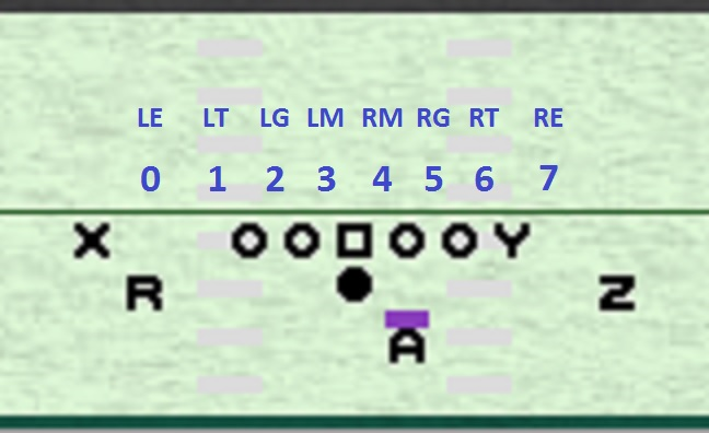 Run Direction (on running plays): The hole the player will try to run the ball into. Middle means to the side of the center, guard means outside one of the guards, tackle means outside one of the tackles and end means outside the tight end (or the area the tight end would be if he were in the formation). Run direction is also numbered, from left to right (some professional teams use odd numbers on one side and even numbers on the other side, but this is one popular way to number run direction).